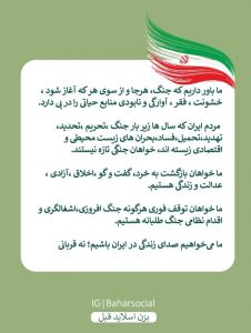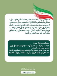 دعوت به همبستگی ۲۲ تیر ۱۴۰۴ | اخبار, فراخوان | 0 دیدگاه زمان تقریبی مطالعه : کمتر از یک دقیقه نسخه مناسب چاپ ==https://www.instagram.com/baharsocial?igsh=MWhyZHBjcTU1M25mZg دعوت به همبستگی، موسسه بهار، خرمشهر، توقف فوری جنگ این مطلب را به اشتراک بگذارید: